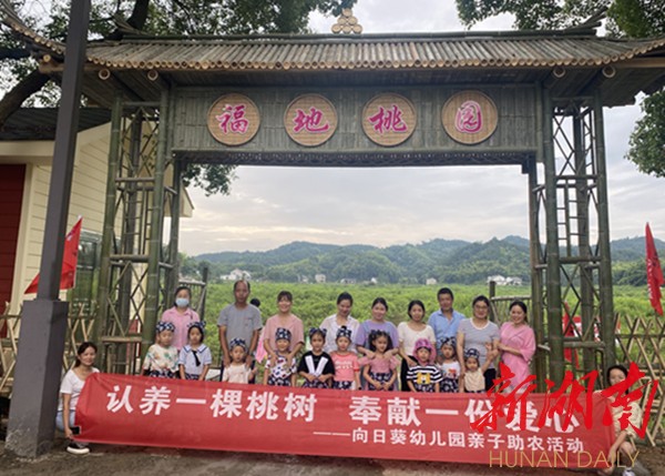 在桃花源旅游管理区,除观赏桃外,还有千余亩果桃林,桃林的收成直接影响着村民的收入,为了助推乡村振兴,带动区域旅游经济发展,兼顾疫情后的出行安全和桃子成熟后的销售难问题,防止出现6月份果桃成熟后卖不出去“烂在树上、落在地里”的情形,桃仙岭村与湖南馨心公益达成“共享一棵桃树”公益活动计划。桃花源向日葵幼儿园有14名小朋友每人认养了一棵桃树,成为这个公益活动的最小参与者。