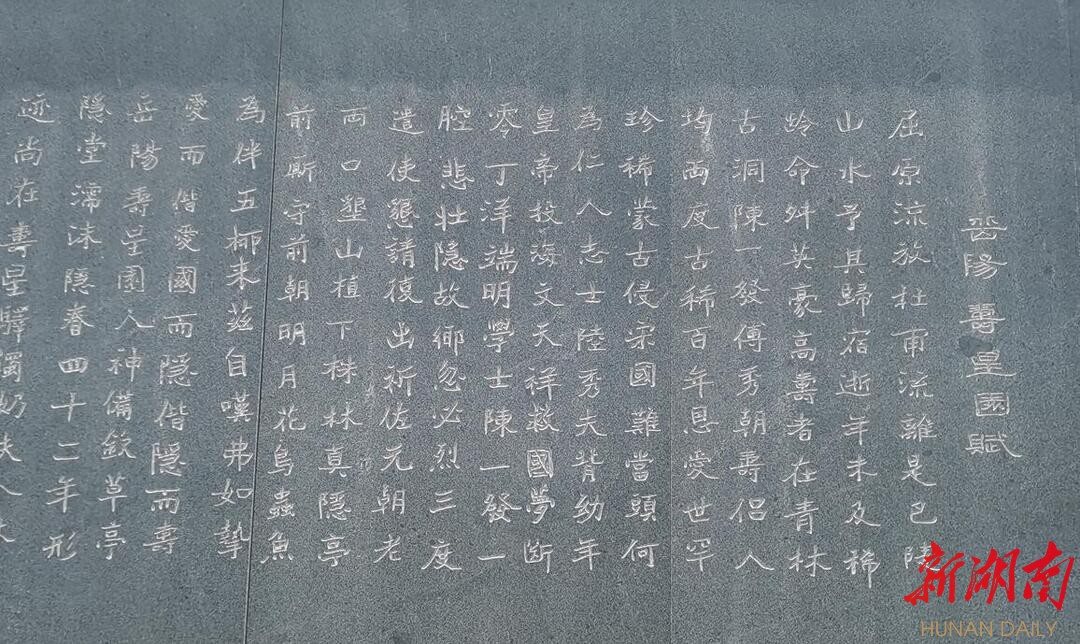 噫乎!寿星园地处偏僻,然名姱誉远,何也?盖不独因其地灵,亦更因其人杰矣。昔陈公一发,与妻傅氏居此七十八年。忠其国而笃其行,守其德而坚其志。乡民敬仰得长生,双臻鹤算,本乃无心;天人相应成大道,同列寿星,实非刻意。历八百载,时虽易而墨色新,世慕濡沫深情;地虽僻而惠风和,人崇爱国志士。岁流苒苒,德音益昭;鹿鸣呦呦,琴笙未止。近逢景区升级,吾忝效颦,聊附风雅,勉为之赋,并殷殷祝颂以寄。