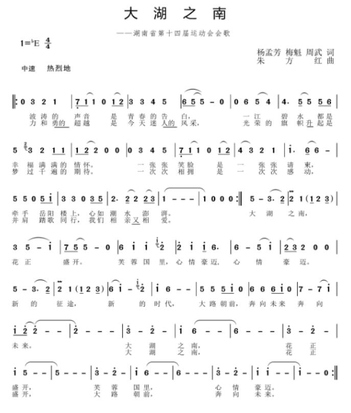 作品《大湖之南》,歌名取于洞庭湖南方的地理概念,有大湖南的意象和包容、团结、拼搏、向上、繁荣的精神气质。作品以亲切朴实的语言描绘了在美丽的洞庭湖畔岳阳,万众瞩目,意气风发,青春萌动的赛事场景。是一幅美丽新湖南的生动画卷。歌词“一江碧水”源于习近平总书记“守护好一江碧水”的嘱托,是美丽岳阳的一张崭新名片:浩瀚洞庭和千古名楼是文化名城岳阳的“金字招牌”。作品音乐形象生动,节奏欢快,旋律新颖,有很强的时代感。表现出超越赛事本身的建设美丽新湖南的喜悦、热情、进取、和谐的精神风貌,易于传唱。