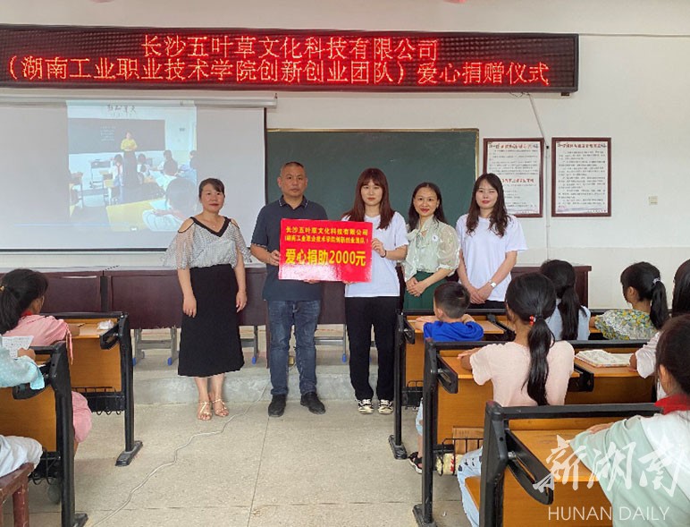 江永县上江圩镇中心小学,该团队将女书文创产品在大学校园内摆台销售所得收益捐赠给该校学习女书的贫困学生,鼓励她们好好学习女书,播下传承女书文化的种子。