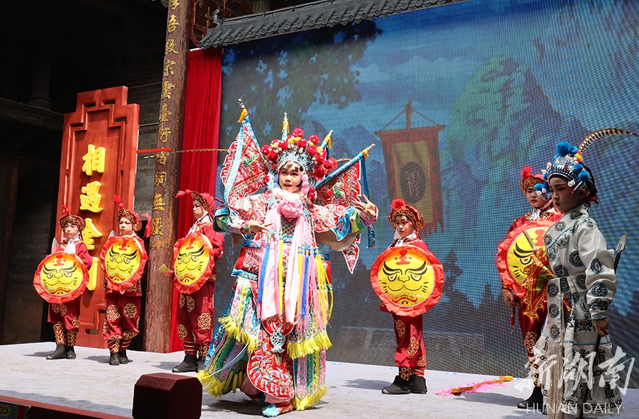 6月10日,浏阳市金刚完小,学生在表演湘剧《湘味戏妞》。当天,2022年浏阳市非遗宣传月启动式暨金刚镇“湘剧四季 相遇金刚”文艺活动举行。《拜月记》《追鱼记》《琵琶记》《白兔记》等传统剧目陆续上演,为观众带来一场精彩的视听盛宴。该镇是湘剧高腔的发源地,从这里走出了徐绍清、欧阳寿廷等湘剧泰斗。 湖南日报全媒体记者 赵持 王文隆 摄影报道