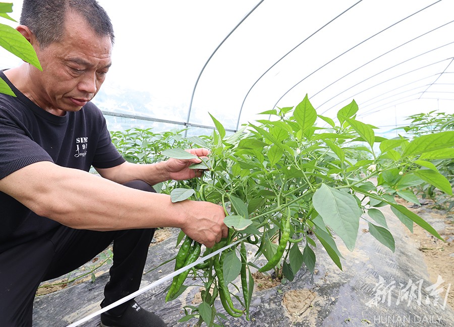 6月2日,浏阳市普迹镇新府村蔬菜种植基地,农民在大棚内采摘“再生辣椒”。该村试验种植“再生辣椒”,亩产预计3000斤以上,每亩可增收约1万元。 湖南日报全媒体记者 赵持 摄