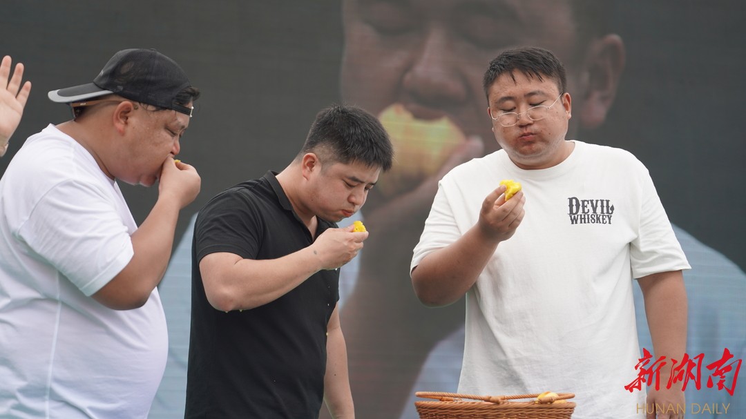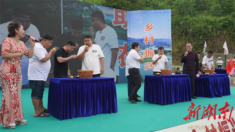 启动仪式现场的最高潮,是现场吃黄桃比赛。3组选手、每组3人,有黄桃种植者、有村民、有客商、有电商、有古丈政府办的驻村干部。