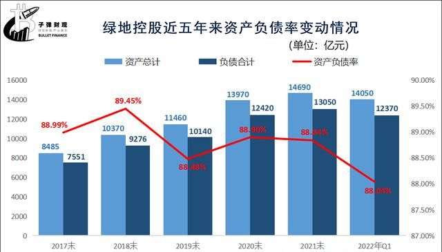 财报显示,截至2022年一季末,绿地控股总资产为14046.3亿元,总负债12370.1亿元,资产负债率高达88%。
