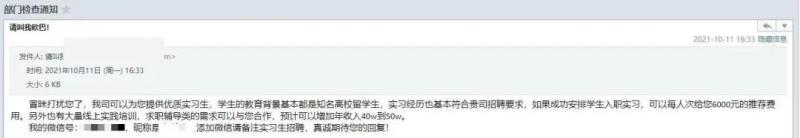 某上海投行的HR金竟(化名)就曾收到这样一封寻求内推合作的邮件,“如果成功安排学生入职学习,可以每人/次给6000元的推荐费用。另外有大量线上实践培训,求职辅导类的需求可以合作,预计可以增加年收入40w到50w。”
