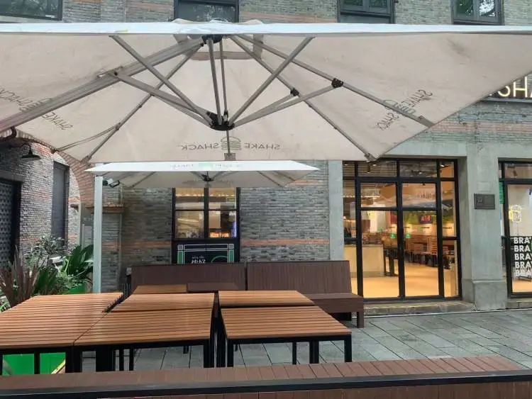 新天地北里的SHACK SHACK,原本开放的外摆位也进行了调整,桌、椅分别被归拢在一起,消费者只能通过线上点单后完成自提。门外至少有4名工作人员值守,有的负责引导扫码点单,有的负责叫号,有的则负责维持秩序、解答顾客提出的问题。