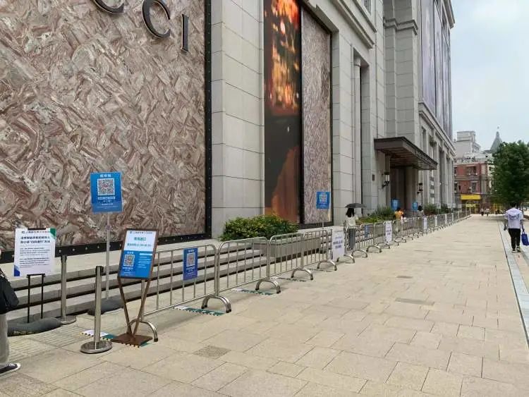 记者注意到,新世界大丸百货可供正常进入的大门只留了南京东路228号这一扇。门前用隔离栏围起了长长的入场通道,每隔7、8个“2米线”的标志,就设有一处“场所码”可供扫码。