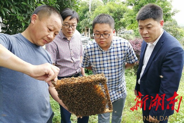 阳永耀(右一)在了解蜂蜜养殖情况。