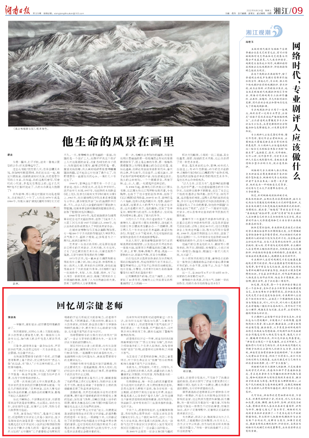 后来我和同学夏昕对胡老师做过一次专访,谈当时文坛的“尴尬与失落”。文章发在《永州日报》上,但胡老师毫不客气地批评了我们表述上一些不准确、不严谨的地方。这对我后来从事新闻工作,确实也起到了警醒和教育的作用。