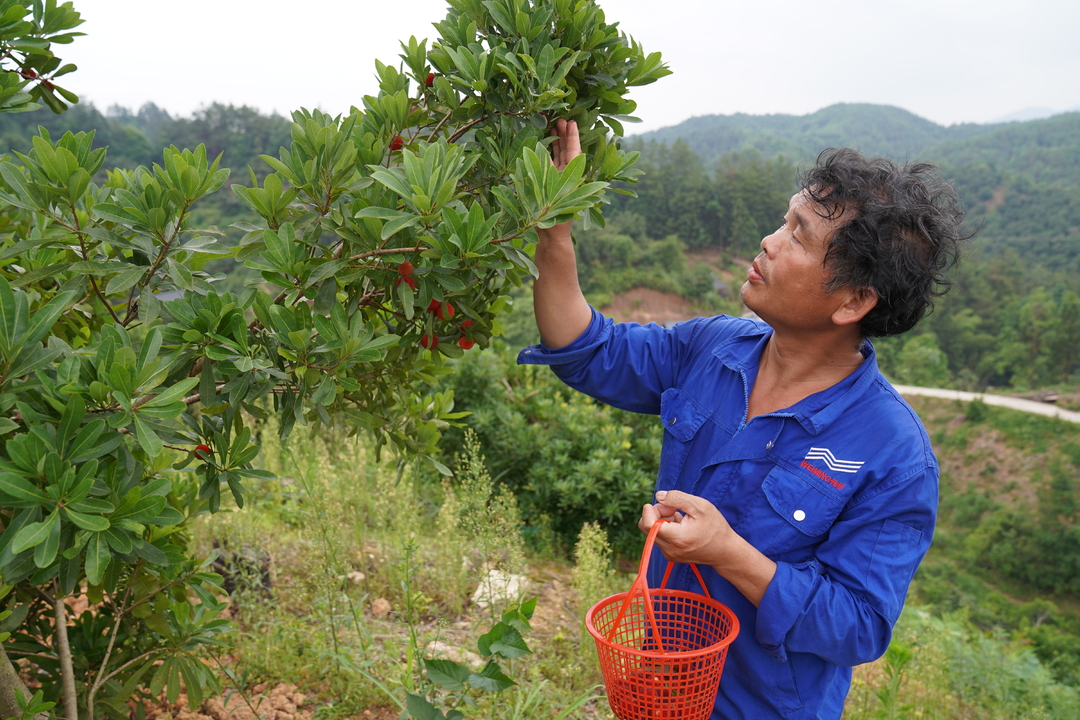 梅子熟了,生活甜了。6月9日,记者在邵阳市绥宁县长铺子苗族侗族乡游家村华顺家庭农场杨梅种植园见到杨梅丰收喜人一幕,一颗颗色泽艳丽的杨梅挂满了枝头,饱满的果粒渗出玫瑰红,一口咬下去,酸甜的汁液在唇齿间弥漫,吸引不少游客前来采摘尝鲜。