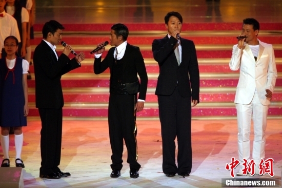 2007年6月30日晚,庆祝香港回归十周年大型文艺晚会在香港会展中心举行。图为香港四大天王张学友、黎明、郭富城、刘德华合唱《始终有你》。中新社记者 武仲林 摄