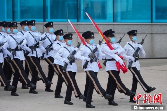 2021年7月1日,香港特别行政区政府在金紫荆广场举行升旗仪式,庆祝香港回归祖国及香港特别行政区成立24周年。图为七一升旗礼护旗方队首次以中式步操入场。中新社记者 张炜 摄