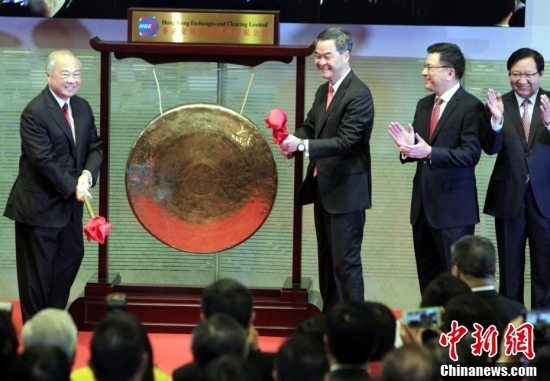 2014年11月17日,香港交易及结算有限公司(香港交易所)举行“沪港通”开通仪式。时任特首梁振英、时任港交所主席周松岗等嘉宾主持敲锣典礼。中新社记者 洪少葵 摄