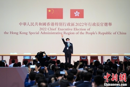 2022年5月8日,李家超当选香港特别行政区第六任行政长官人选。图为李家超当选后挥手致意。中新社记者 张炜 摄