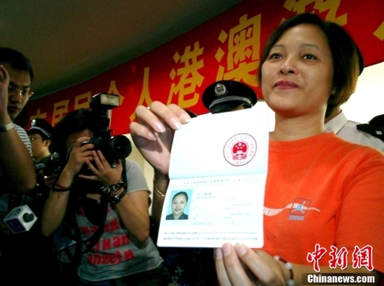 2003年8月20日,广州、深圳、珠海三地个人游港澳开始实施,公安出入境管理部门特别增加受理点,以方便市民办证。图为广州市第一个领证申请人何燕嫦女士。中新社发 陈文 摄