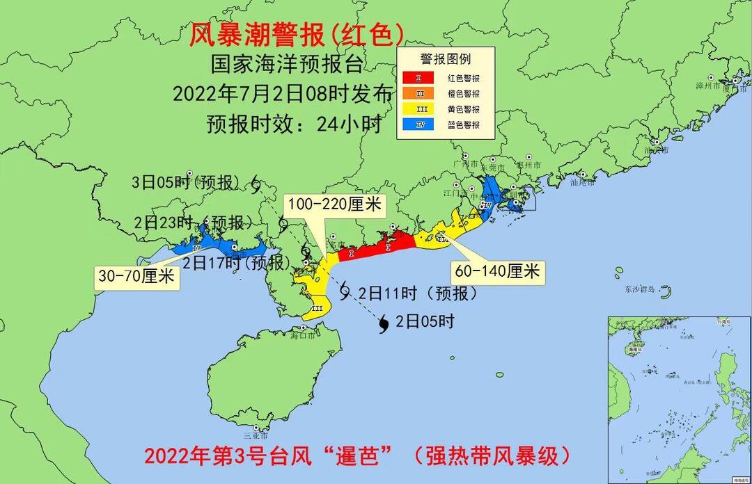 风暴潮方面,预计7月2日上午到3日上午,珠江口到广东江门沿海将出现60到140厘米的风暴增水,广东阳江到雷州半岛东岸沿海将出现100到220厘米的风暴增水,7月3日凌晨到上午,广西沿海将出现30到70厘米的风暴增水。上述岸段内的广东水东和北津潮位站将于2日中午出现达到当地红色警戒潮位的高潮位。广东省茂名市和阳江市的风暴潮预警级别为红色,广东省珠海市、江门市和湛江市的风暴潮预警级别为黄色,广东省深圳市、广州市和中山市的风暴潮预警级别为蓝色。