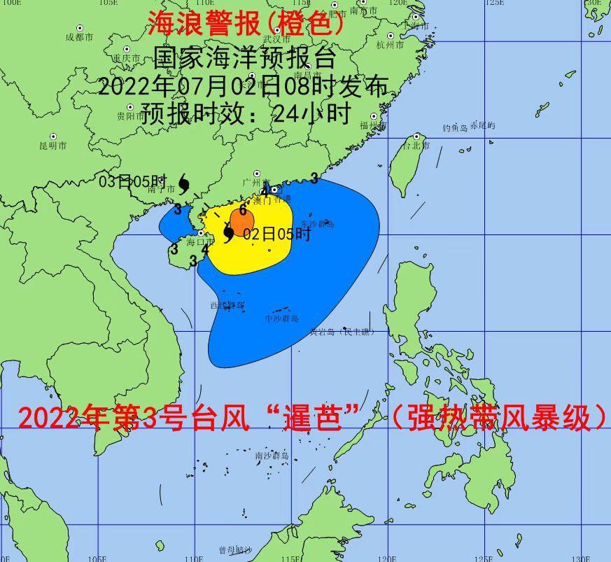 海浪方面,预计7月1日夜间至2日白天,预计7月2日中午至3日中午,南海北部将出现4.0到7.5米的巨浪到狂浪区,近海海域海浪预警级别为黄色;广东近岸海域将出现3到5米的大浪到巨浪,该近岸海域海浪预警级别为橙色;海南东部近岸海域将出现3到4米的大浪到巨浪,该近岸海域海浪预警级别为黄色;广西近岸海域将出现2到3米的中浪到大浪,该近岸海域海浪预警级别为蓝色。