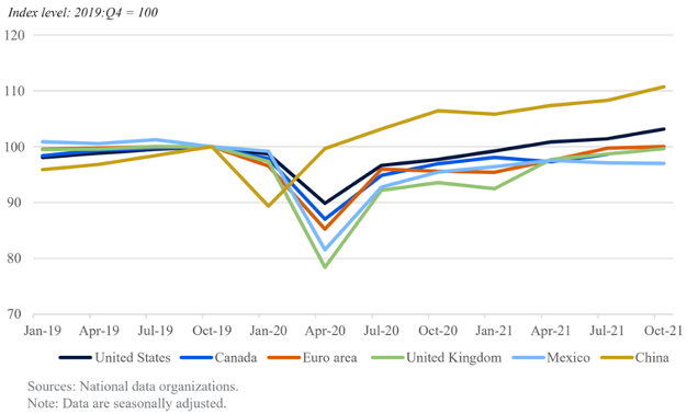 以2019年第四季度为基准的真实GDP曲线,可见疫情后美国真实GDP增长缓慢
