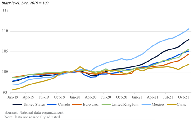 以2019年12月为基准的CPI曲线,可见疫情后美国物价上涨明显