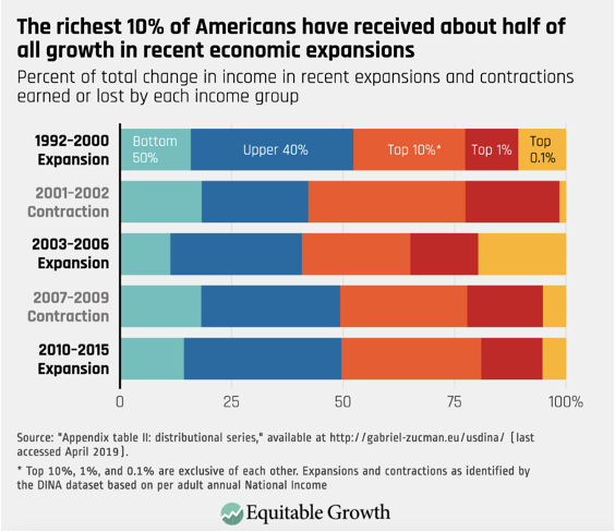与常见的印象不同,过去几十年来,劳工阶级从美国的经济增长中获益甚少。自1980年以来,美国最富有的10%人口占据了所有经济增长的一半以上,而收入低于中位数的劳工阶级只获得了经济增长的10%。在过去三十年的三次经济增长期中,收入前10%的人每次都获得了所有收入增长的一半左右。在2000年到2020年的二十年间,收入低于中位数的家庭收入几乎没有增长。