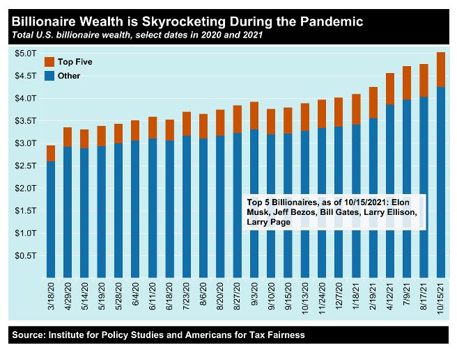 富人甚至能从疫情大流行中获益。2020年3月,美联储启动了无上限量化宽松政策,截至年底其资产负债表规模扩张了5.2万亿美元。特朗普和拜登分别签署了2.2万亿和1.9万亿美元的经济救助计划。这些增发的货币很快让美国股市回到了历史高点,从而让拥有股票的富人变得更富有。到2021年10月,美国亿万富翁的财富总量达到了5万亿美元,相比2021年3月增长了70%,其中排名前五的富豪(伊隆·马斯克、杰夫·贝索斯、比尔·盖茨、拉里·艾利森、拉里·佩奇)的财富增长了118%。所以2020年4月底疫情正在造成第一个死亡高峰时马斯克在推特上高喊“把人们的自由还给他们”也就不足为奇,毕竟工人在家封控的每一天都意味着他累积财富的速度被减慢了一点点——马斯克在疫情期间财富增长了7倍,成为世界首富。