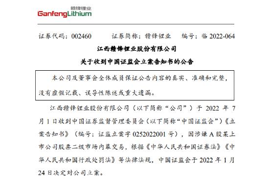 赣锋锂业公告披露,公司于7月1日收到中国证监会《立案告知书》,因涉嫌A股某上市公司股票二级市场内幕交易,根据法律法规,中国证监会于2022年1月24日决定对公司立案。
