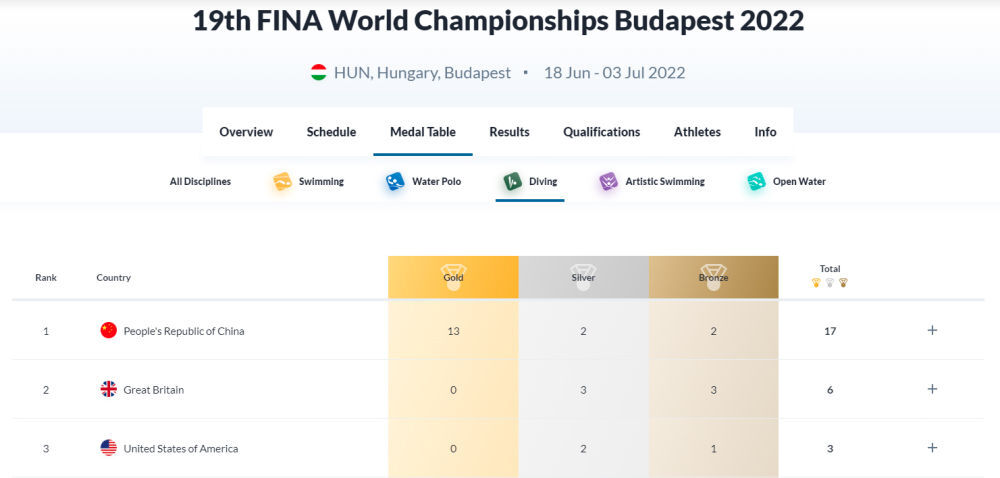 13金,2银,2铜!17人的中国跳水队在8天内席卷全部项目冠军,并且实现中国跳水世锦赛突破100金,帮助中国队在本届游泳世锦赛奖牌榜排名第二,金牌数排名并列第一。