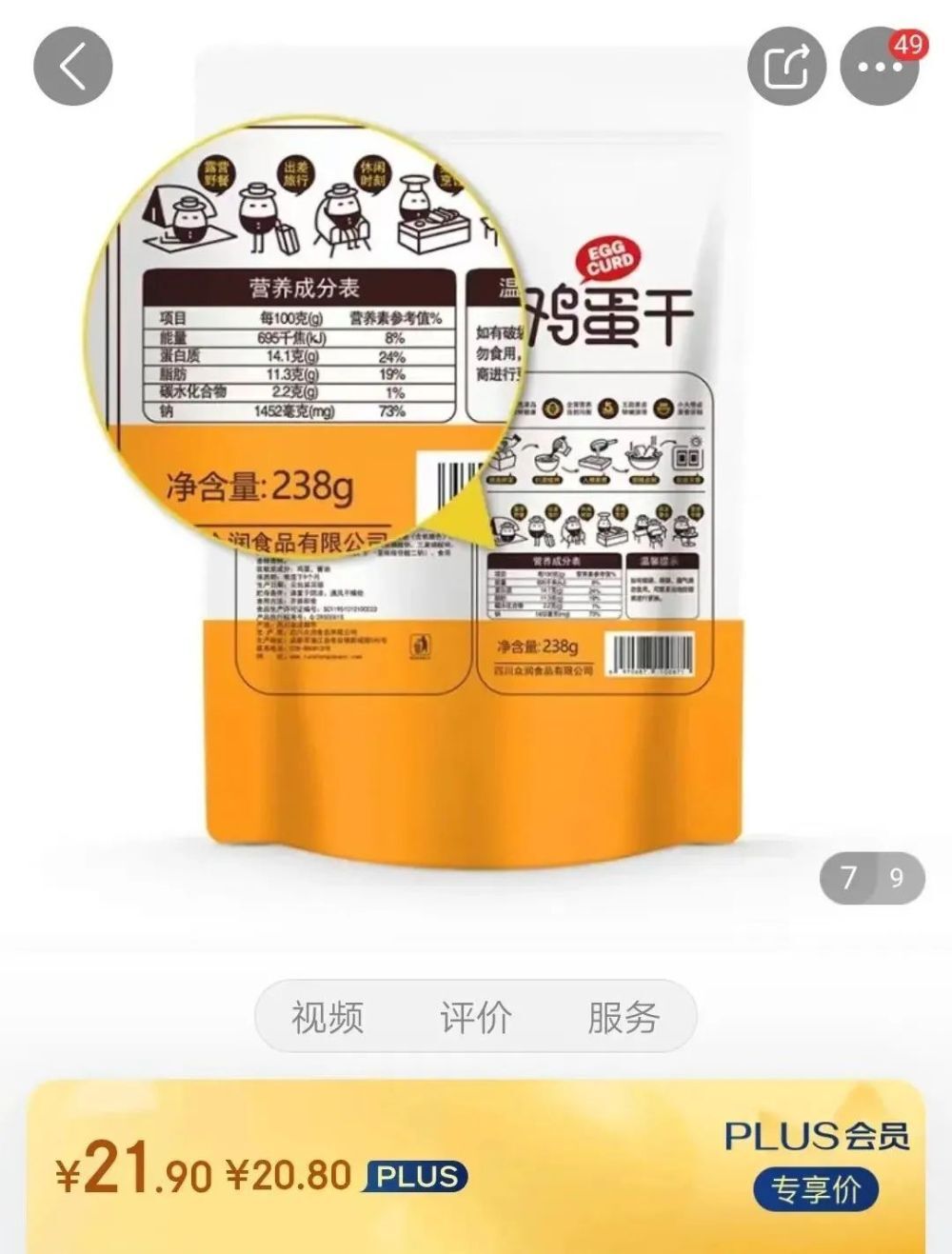 润成一款小包装售价21.9元的鸡蛋干产品钠含量达到了1452毫克,NRV更是高达73%。