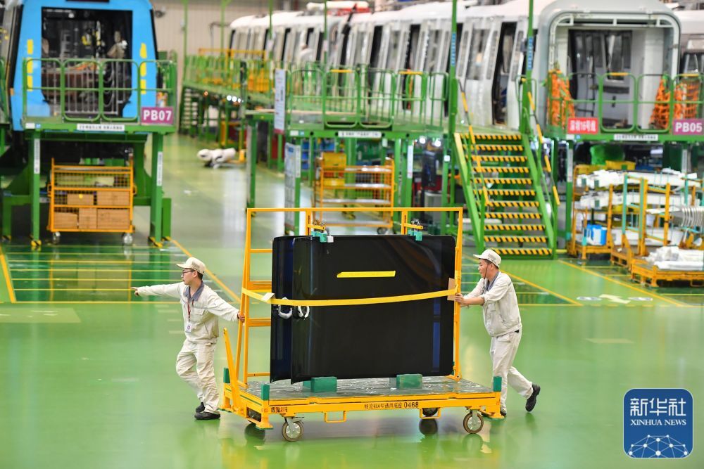 ↑7月5日,在中车株洲电力机车有限公司城轨事业部总成车间,工人在运送物料。