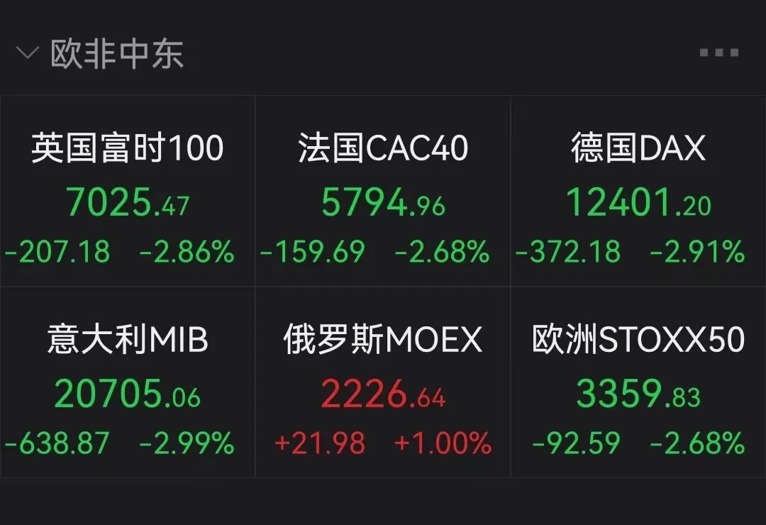 欧股收盘全线下跌,德国DAX指数跌2.91%报12401.2点,法国CAC40指数跌2.68%报5794.96点,英国富时100指数跌2.86%报7025.47点。