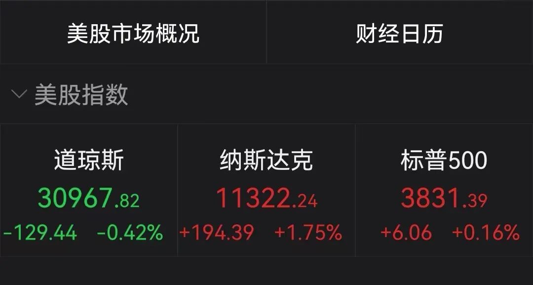 周二(7月5日),美国三大股指收盘涨跌不一,截至收盘,道指跌0.42%报30967.82点,标普500指数涨0.16%报3831.39点,纳指涨1.75%报11322.24点。