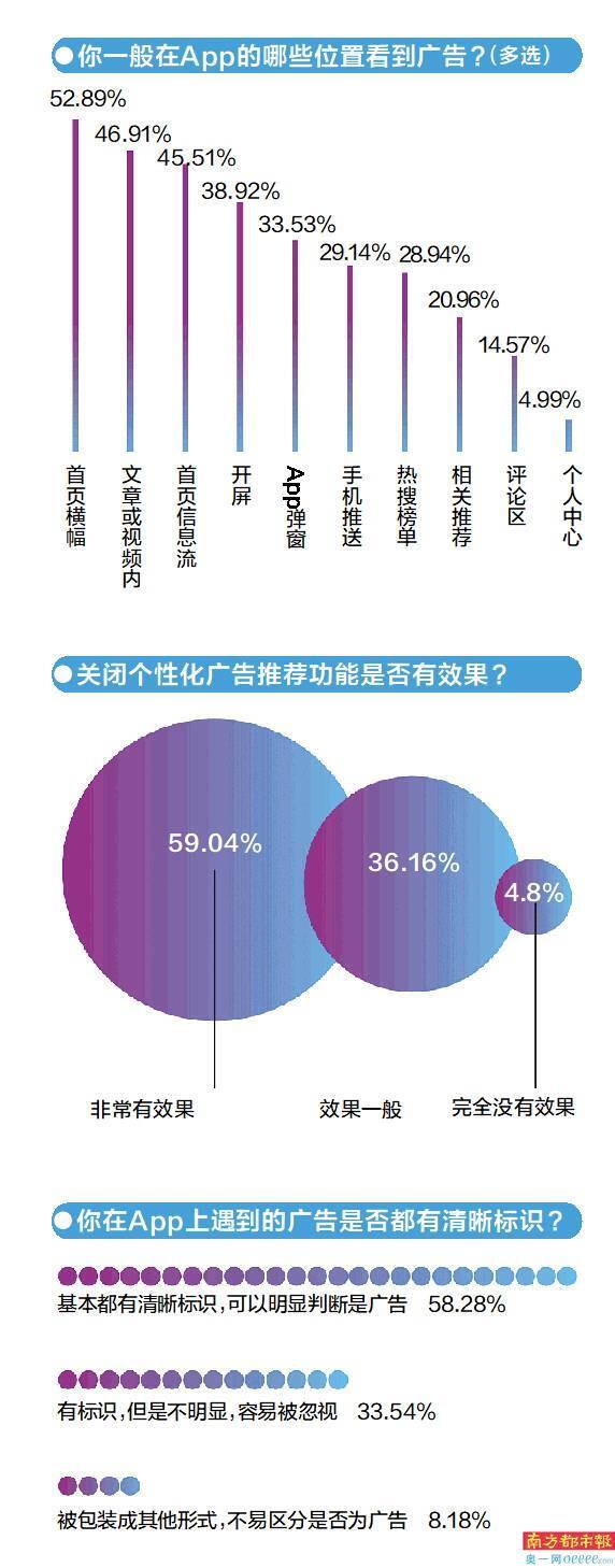 调查结果显示,App首页横幅、文章,或视频内及首页信息流是广告最常出现的位置。此外,App开屏和弹窗也是广告“新发地”。