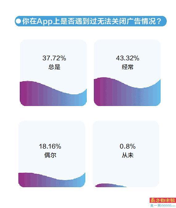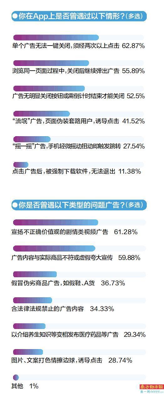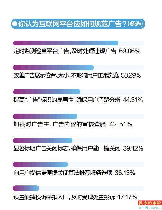 “不正经的广告跟牛皮糖一样关不掉,还贼灵敏,一不小心就点到了”“给老年人扫码录信息,打开全是广告弹窗”……互联网平台广告给用户带来的“烦恼”不少。2022年5月,南都大数据研究院围绕“互联网平台广告合规体验”,面向网络用户展开问卷调查。调查显示,八成多受访者表示曾遭遇互联网广告无法关闭、“伪装”骗取点击、“摇一摇”乱跳转、虚假宣传等乱象。近七成受访者期盼互联网平台加强对广告的监测巡查,及时处理违规广告。