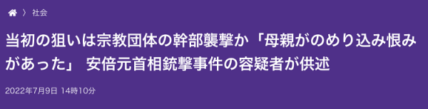 《东京新闻》报道,警方透露,山上在供述中称:“我的母亲执迷某宗教团体,导致我心怀怨恨。我了解到安倍与这个团体有联系,所以对安倍起了杀机。”《朝日新闻》还称,山上说:“在过去,我的家人曾成为某宗教团体的信徒,并向这个团体捐献钱财,导致生活困顿。”