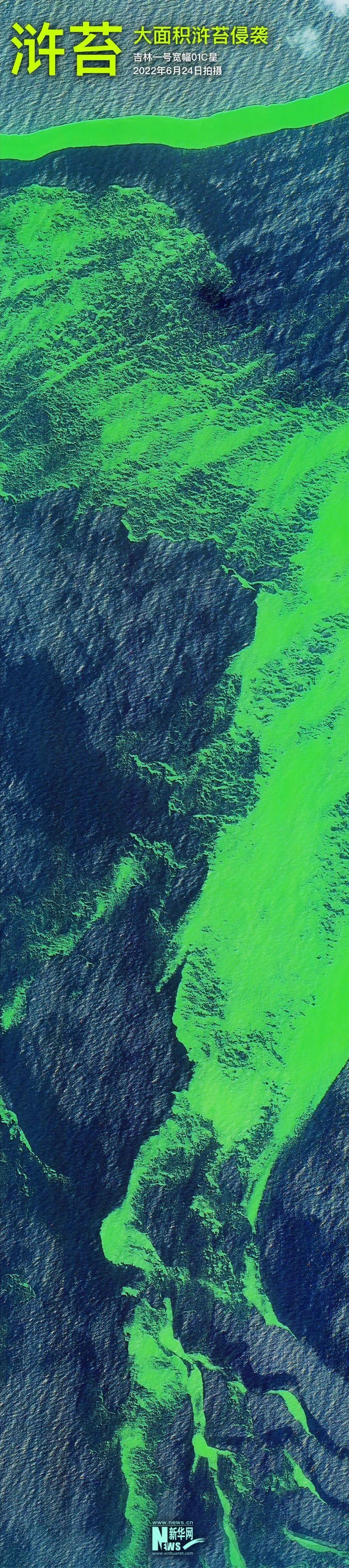 成片的绿色浒苔漂浮在海面上,与蓝色海水形成鲜明色差。制图:长光卫星