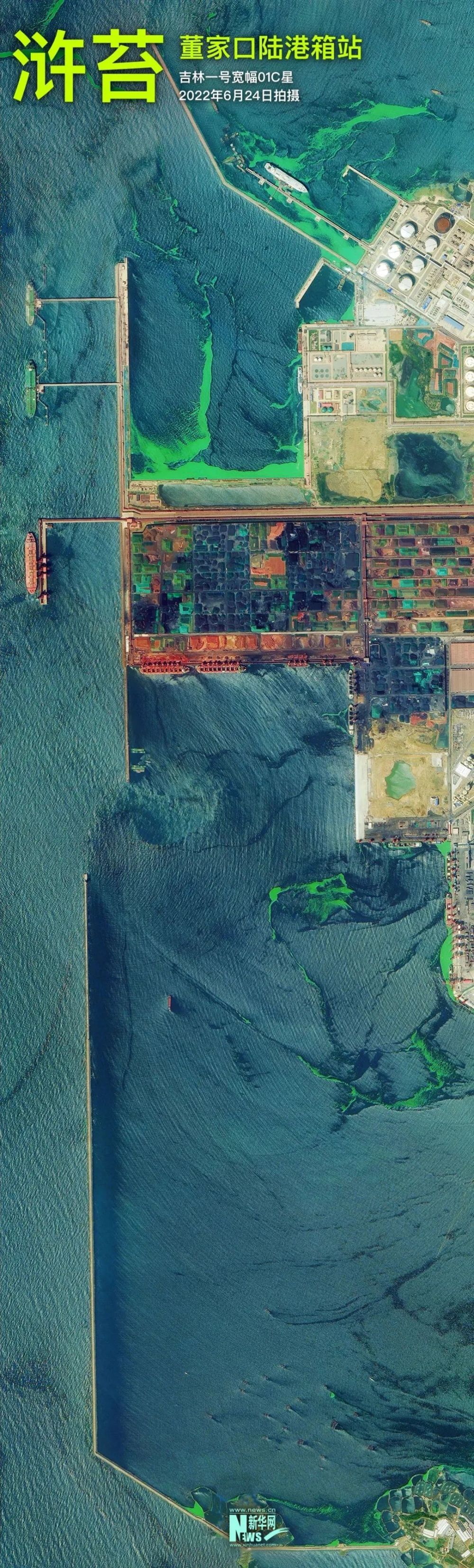 在青岛董家口港站附近,浒苔沿着码头边缘蔓延至各个角落。制图:长光卫星