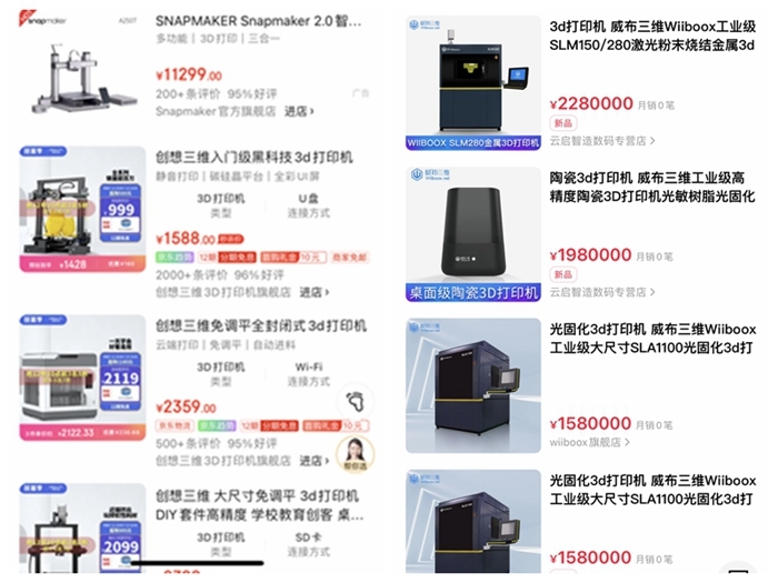 中新财经记者在多家电商平台看到,3D打印机从几百元到几百万元的都有。有专业的3D打印机厂商对中新财经表示,以耗材为金属的3D打印机为例,从几千元到几千万元的都有,主要看用途。