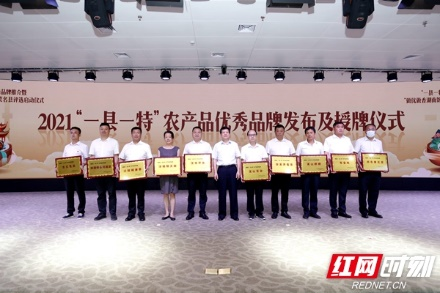 ▲获评“一县一特”农产品优秀品牌的20位代表获授牌。