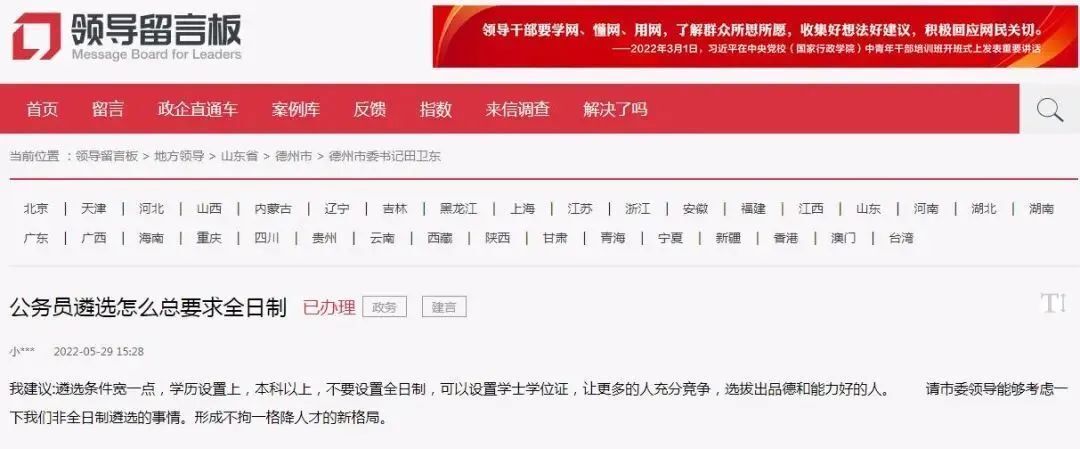 山东德州一网友通过人民网“领导留言板”留言,建议公务员遴选时放宽学历限制:“遴选条件放宽一点,学历设置成本科以上,不要设置全日制,可以设置学士学位证,让更多的人充分竞争,选拔出品德和能力好的人。”