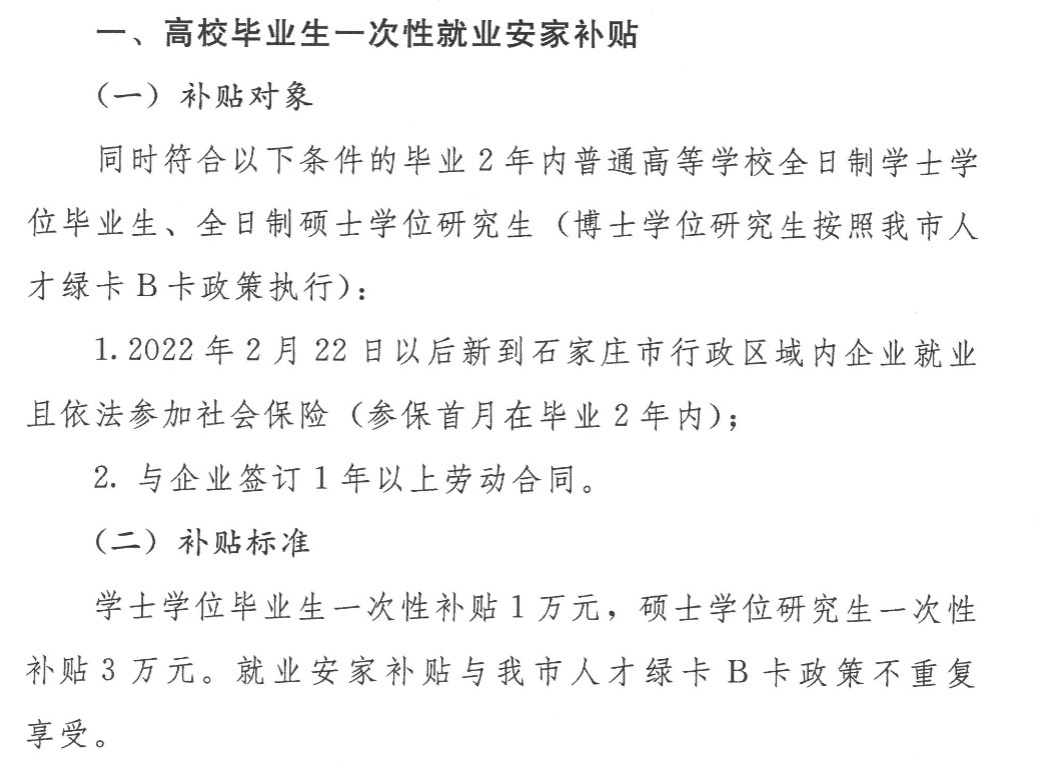 在关注到媒体对于石家庄人才补贴政政策的相关报道后,石家庄市人力资源和社会保障局会同市财政局对此前联合印发的《石家庄市高校毕业生一次性就业安家补贴等5项奖补实施细则》(石人社发〔2022〕6号)进行了重新审定。