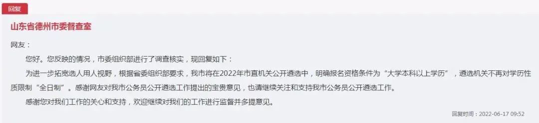 收到网友留言后,山东德州市委组织部进行了调查核实,回复称,为进一步拓宽选人用人视野,根据山东省委组织部要求,德州市将在2022年市直机关公开遴选中,明确报名资格条件为“大学本科以上学历”,遴选机关不再对学历性质限制“全日制”。