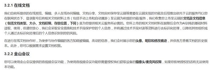 WPS用户隐私协议中涉及到AI将用户内容读取、使用的描述。WPS用户隐私协议截图