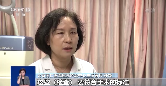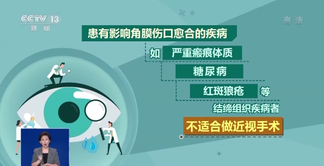 北京同仁医院屈光矫治中心主任医师 齐颖:不能有一些像类风湿的疾病,不能有比较严重的影响视力的眼睛的急性症状,或者说一些视网膜的病变。还有就是要做眼睛的全面检查、系统检查,角膜厚度、(角膜)地形图这些要符合手术的标准,才能做近视手术。