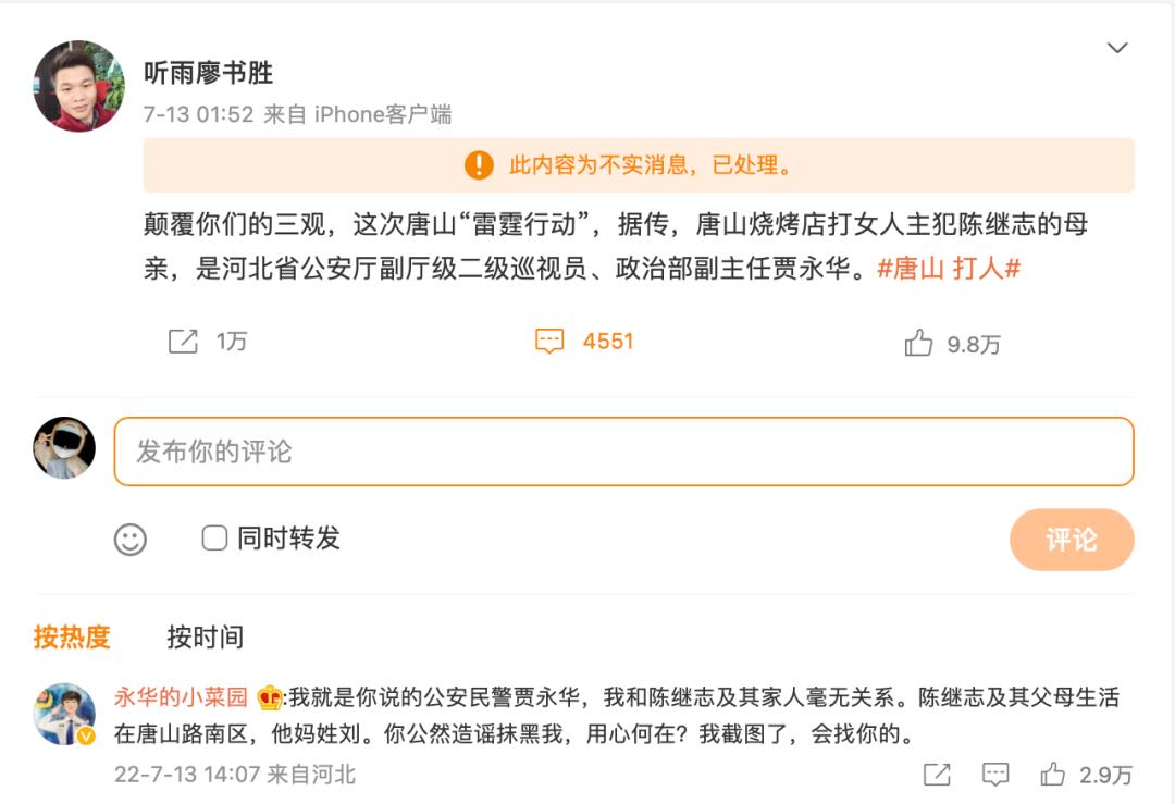 7月13日,微博用户@听雨廖书胜 在微博发文称,“据传,唐山烧烤店打女人主犯陈继志的母亲,是河北省公安厅副厅级二级巡视员、政治部副主任贾永华。”