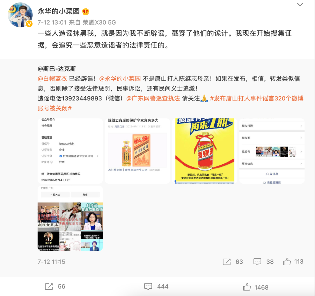 7月12日,她曾在一条转发的微博中写道,“一些人造谣抹黑我,就是因为我不断辟谣,戳穿了他们的诡计。我现在开始搜集证据,会追究一些恶意造谣者的法律责任的。”