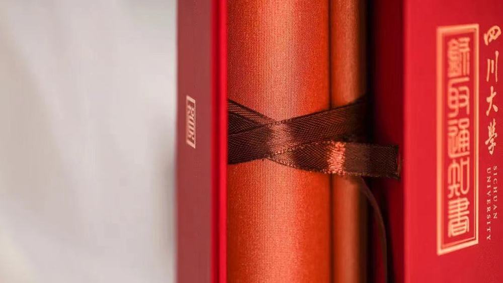 川大的录取通知书以“锦凤传书”为设计概念。卷首是一只凤鸟,凤首口衔录取通知书。卷尾是翻涌的海浪,象征川大“海纳百川,有容乃大”的校训。