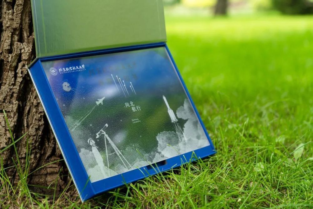 北航70校庆录取通知书礼盒讲述了一个关于“梦想”的故事。打开银色外盒,首先映入眼帘的是一套叠加梦想的亚克力卡片。蔚蓝的星空下,怀着好奇与探索的少年遥望着蓝天宇宙。直上云霄的飞机、问鼎苍穹的火箭、翱翔寰宇的卫星……每一张卡片都寄寓一个梦想,少年的空天梦帷幕拉开。“北航70载·北斗七星”徽章静静躺在盒底。7枚徽章以北斗七星的形状渐次排开,历数建校光辉岁月。