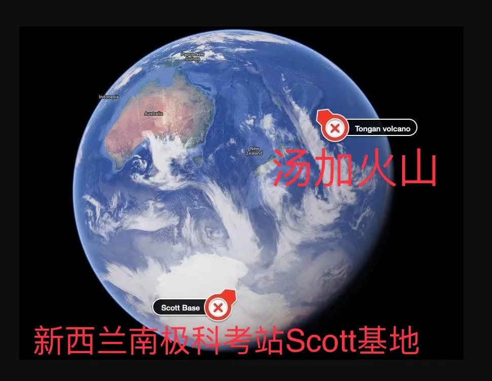 △照片拍摄地点新西兰南极科考站与火山喷发地点汤加