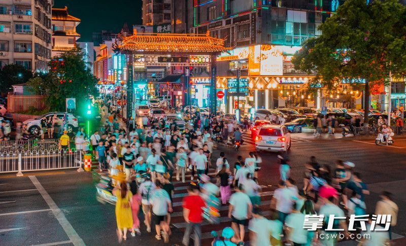 晚9时,三王街牌楼口,络绎不绝的年轻人奔赴一场纳凉休闲的美食之旅。长沙晚报全媒体记者 邹麟 摄