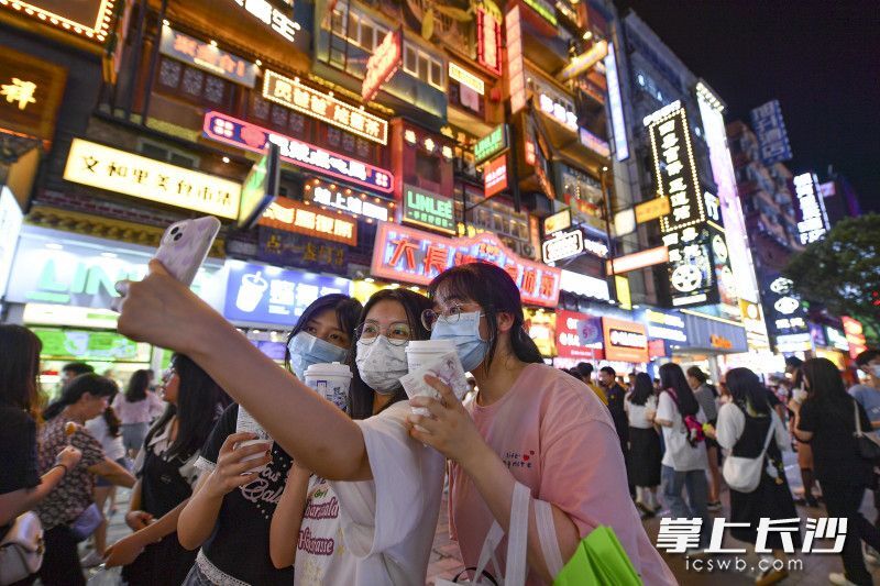 被赵立坚推荐的大长沙美食城寨,人气越来越旺。几位年轻游客在黄兴路步行街美食城前拍照。长沙晚报全媒体记者 郭雨滴 摄